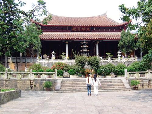 大雄宝殿作为寺院的中心,宽广的台基,宽厚高深的主体,显示殿堂的宏伟庄严。曲面的屋顶,弯曲的屋脊飞檐,及神态各异的小兽,使庞大高耸的屋顶显得格外生动、轻巧,为原本呆板笨大的殿堂装上了美丽的冠冕。又以鲜艳的琉璃屋瓦与土红色的门窗,为大殿主体增色,使翠碧的山林增添了灵气。大殿顶板的的“飞天”彩绘,是佛教艺术中的奇葩。她以轻盈舒展的体态,飘曳流畅的披纱,凌空飞舞,给庄严肃穆的殿堂带来了灵动感,增加了艺术逸趣。