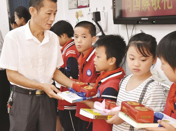在中秋佳节之时,华亭第一中心小学校长林元富,与留守儿童一起过中秋,深情表达了对留守儿童的关心和节日祝福。希望孩子们养成乐观积极的生活态度,体谅父母不能陪伴的难处,做一个勤奋好学,独立自强的好孩子。同时,为孩子们分发月饼、水果和书籍,送去节日的祝福。每本书上,林元富还亲手在书籍上为留守儿童写下寄语,希望孩子们能知道学校一直在关心着他们,希望孩子们能好好学习,天天向上。