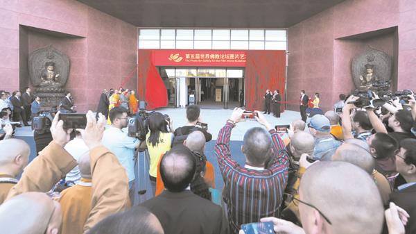 揭幕环节随即进行,雷春美部长、郑建闽副省长、黄进发厅长、林宝金书记、刘金光社长、演觉副会长、帕松列龙庄勐副会长、珠康副会长、梵志长老、宽静理事长等一起为第五届世界佛教论坛图片艺术展揭幕,并与出席仪式的嘉宾们步入展馆饶有兴致的参观欣赏图片及展品。
