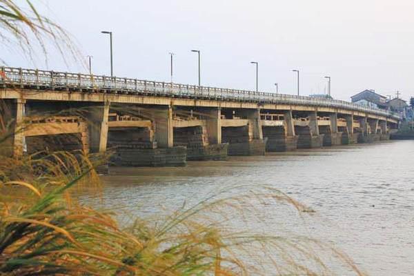 又若干年,石梁告成,坚致宏壮,视前之制增而崇之者余七尺,重作巨梁十五间;累址于渊者十有四;修八百二十尺,广二十尺,高三十八尺;仍贴石于两岸,洎甃石水底,用以防湍囓。桥之上,翼以扶栏,修与桥称。葺其招提(寺院的别称)之倾坏漶漫,与南北二亭之仆者而复以建。