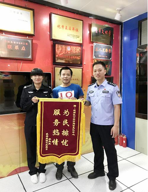 本报讯 近日,华亭镇山牌村村民李先生携带一面印有“为民排忧、服务热情”字样的锦旗,来到城厢公安分局信息化警务中心对查找手林梅妹、王乔曼热情为民,加班加点,排忧解难,帮助找回老人表示致谢。