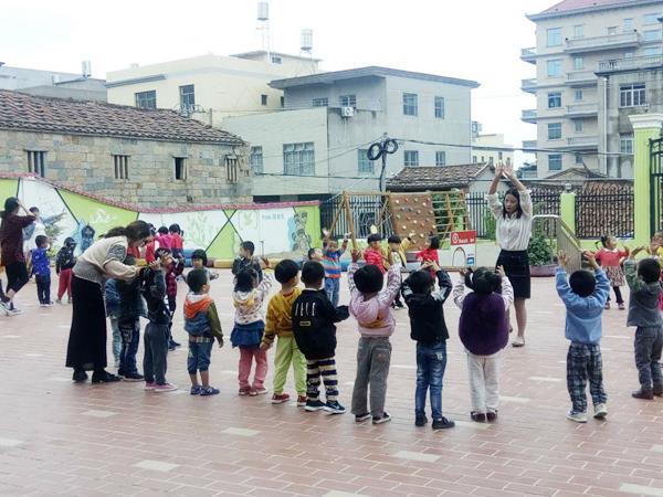 该园根据新入园幼儿的年龄特点以及各方面能力的需要,小班组老师利用课余时间对早操动作进行分析调整以及规范,让动作更为简单优美,动静交替,极富儿童情趣。