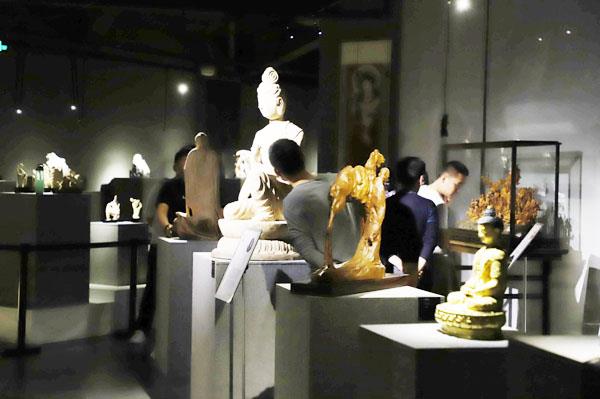 “百佛展”还提供了一种新的参观模式。展览特别增加了适度而考究的照明,柔和的灯光把典雅的佛造像和精美彩绘展现在观众眼前。灯灯相映,灯灯相照,佛光灯光相融,暗含以灯破暗、象征以智能除惑的佛理深义。空间、作品与观者相互映衬,制造出情景交融的观赏感受,艺术气息也在更广泛的维度上得以被发散。观展之余,环球工艺城还将一颗颗装置作品“月”安放在展馆中,与遥遥秋月对望。