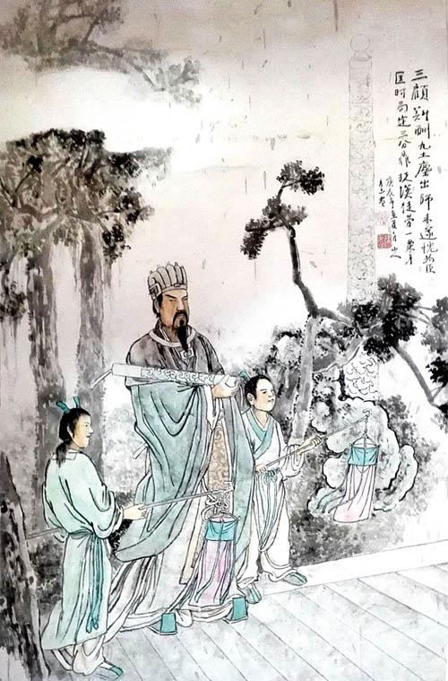 ▲款识:三顾难酬九土尘,出师未遂愧为臣。匡时局定三分鼎,扶汉徒劳一粟身。庚辰年孟夏之月山人秀廷画。