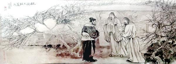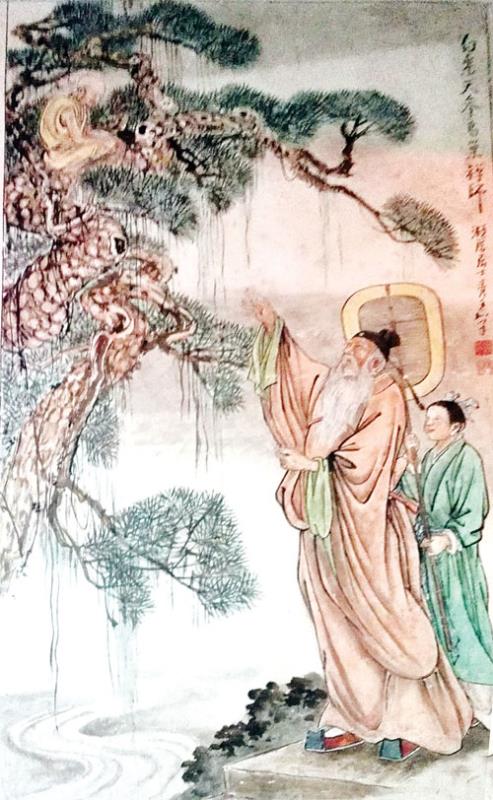 周先生自号“三紫山人”,处江湖阑珊,情性不移,一管酣畅淋漓笔,写尽胸中真山水,挥出平和真性情,从昭灵宫集成之作可见一斑。如其画的古松、人物一般,笔力苍劲,造型洒脱,构图新颖,形神兼备。新加坡著名诗人、书法家潘受曾题他的《东坡玩砚图》,“是谁有此淋漓笔,挥出东坡远谪身。抚砚似闻深一叹,非人磨墨墨磨人。”道似笔墨深情,融为一体,布衣亦可傲卿相!隐遁的三紫山人,沉醉于家乡沉寂的山,清冽的水,心神罹难的独处和寂寞,却锻就了艺术上的炉火纯青。叹叹叹!