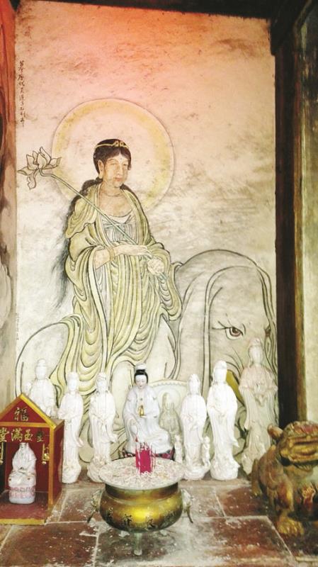 若说濑厝村壁画洋溢着清趣与逸致,那么埔柳村兰亭寺壁画则变幻着禅意与珍奇。周秀廷先生画的观音、达摩,或悲悯深沉,或严谨肃穆。文人雅士、狂傲狷介之士,在笔下各得其所,精、气、神,活灵活现,溢出白壁。他画的古松,笔墨飞动,奇野、苍劲、古朴饱有深情。他临摹唐代吴道子石刻本的观音像神韵飘逸,以曲柔且富有韵律感的的线条表现人物,并且开拓出多