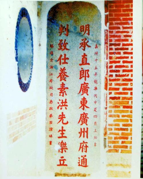 嘉靖十五年(1536)四月,时任浙江布政司右参政洪珠为洪子诚乐立碑书丹,碑文:“明承直郎、广东广州府通判致仕养素先生乐立。”上款:“嘉靖十五年(1536)龙集丙申四月上澣(上旬)吉。”下款:“赐进士出身、浙江布政司参政、弟西淙珠书。”