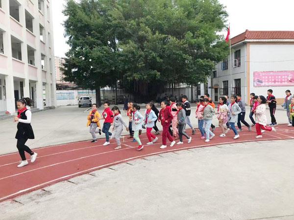 “一、二、一!一、二、一……”西天尾镇后卓小学的操场上空响起了嘹亮的口号声,校长陈丽媛手拿话筒,亲自指挥学校师生进行激情跑操。来自学校8个班级300多位师生齐聚操场上,每班排成4列纵队,由班长在前面领跑,班主任在边上整队,在校长的统一口令下,各班井然有序地绕着红色塑胶跑道慢跑,几圈下来,孩子们兴致勃勃,纷纷表示喜欢这项活动。
