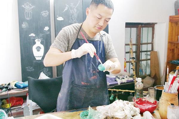 其实,除了制板、描漆、贴金,最考验技艺的是最后的开脸和线条勾勒。在琴桌、屏风、挂屏、牌匾、漆瓶、漆盘等漆画精品琳琅满目的礼耕堂里,傅振文使用笔尖小而硬的铁笔,在人物脸部先勾勒出五官。之后,精心勾勒人物线条,将漆膜刻透至黑色磨光漆板,精致刻画出细小而有力的线条,着重调节明暗,使画面富有立体感。傅振文颇有感触地说道,“开脸这个步骤在画面中起到非常重要的点睛作用,要全神贯注,一气呵成,下笔有轻有重,一定要达到传神。如果说一步画错的话,这个部位就要全部修改,包括要把金箔全部抹掉,从头再来,是个看似简单可操作难度挺大的技术活呢!”