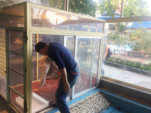 “为了防止动物天冷出现不适,我们已经对某些不耐寒的动物采取了特别措施,通过在它们的‘家’中安装取暖灯以提高温度。当然还有别的办法,比如我们会给大蟒蛇盖被子,给乌龟泡热水澡等等。”动物园的王主任告诉记者。看起来皮糙肉厚的“水上霸王”鳄鱼竟然很怕冷,工作人员也为他们配备了供暖设备“油汀+浴霸”。在水族馆,为了让这里的热带鱼安全过冬,每个养热带鱼的鱼缸里都会放加热棒。“这里的鱼缸每天隔3个小时就要更换、清洗海绵。加热棒的温度不宜过高,一般在20~28℃,温度太高会长海藻。”