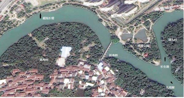 确定了遏流长堤后,其他的陂首工程就不难找到。《八闽通志》记载,延寿陂“陂口别为两派,曰长生港,曰儿戏陂。”又,“儿戏陂在延寿陂上东边。”可知这两个工程在今延寿桥东边。