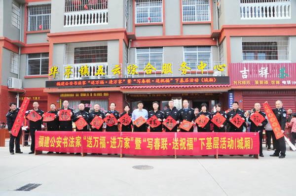 本报讯 1月10日下午,福建公安书法家“送万福·进万家”暨“写春联·送祝福”下基层活动走进城厢区华亭镇五云村,现场写春联送福,共书写赠送“福”字50余个,对联200多副,受到广大人民群众的热烈欢迎。 (陈宏)