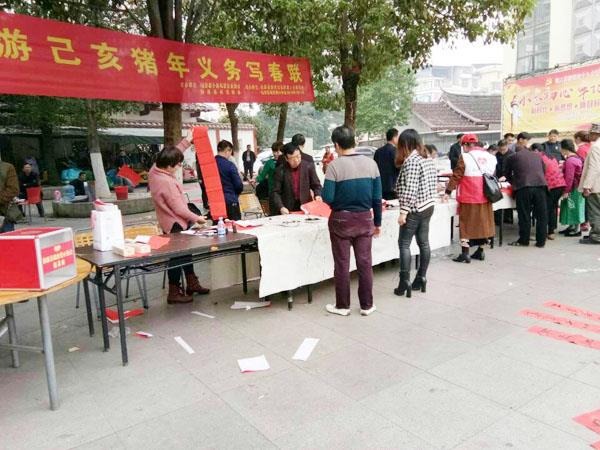 挥毫送春联,接福千万家。1月11日上午,由仙游县个私协会、仙游县书法协会主办,仙游县新联会、瑞容爱心协会协办的“情暖仙游·巳亥猪年义务写春联送万家”活动在鲤中步行街文化广场拉开帷幕,20多位书法名家为市民免费书写春联,人头攒动,暖意融融。短短4个小时,近2000副对联被市民一抢而空,楷书、隶书、草书都有,并收到爱心市民捐献的6860元助学款。