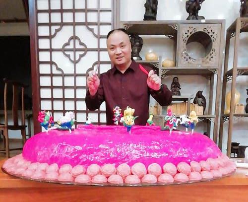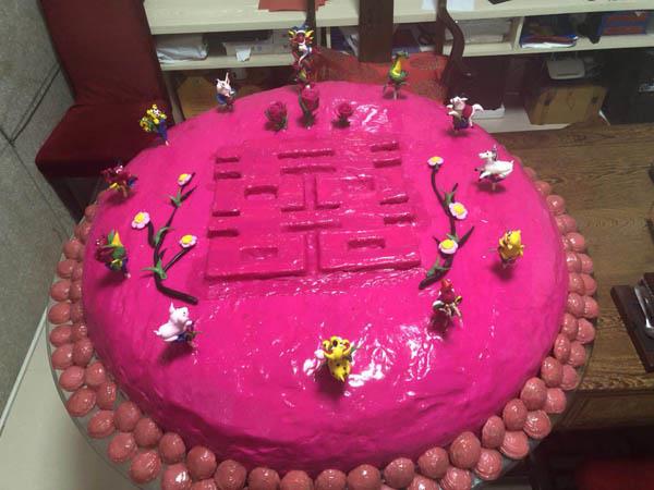 这就是莆田最大的陈氏红团,直径达到一米。这个大红团中间印着一个喜字,周围插着十二生肖的面人,栩栩如生;红团周边还摆了120个小红团,香气诱人,吸引了不少市民拍照。