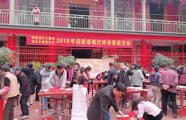 1月20日上午,民盟涵江工委组织部分盟员到涵东办铺尾社区,与社区联合开展第四届新春文化下乡活动。本次活动的主要内容义务写春联、灯谜展猜、图片展、发放移风易俗宣传单和承诺书等。