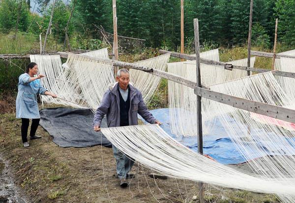 当你走进大济镇大济(社区)后朱生产组,看到家家户户门前面架上一排排洁白长寿面,他们有的在作坊里制作、有的在门前拉面晒面、老人小孩帮忙包扎装箱,虽然气候寒冷,但是他们双手举着面快步穿梭在屋里屋外,一片繁忙的景象。