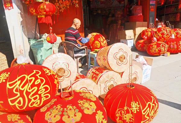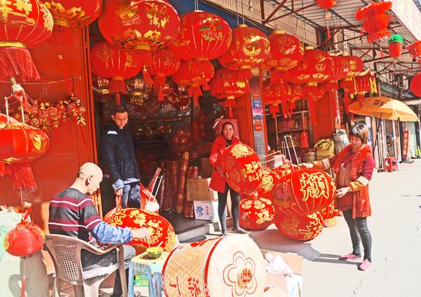 陈大哥正在选购灯笼,准备在春节的时候给家里挂上红灯笼,高高兴兴过一个春节,他说:“这日子越过越好,快过年了,买几个灯笼在家里,添添喜气,过一个祥和的春节!” (陈国松)