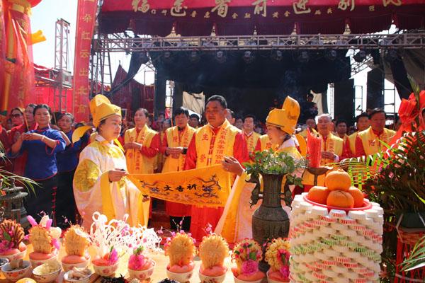 上午十时许,在司仪的主持下,举行了敬献花篮、三献礼等仪式,湄洲妈祖祖庙等为新落成的东皋妈祖文化园天后宫送去牌匾等,活动期间,还向建设东皋妈祖文化园发起人、功德主等颁发荣誉证书等。“新建成的天后宫建筑占地365平方米,采用木石主料构建,是妈祖文化园的配套建设工程之一”。村民翁文荣告诉记者。