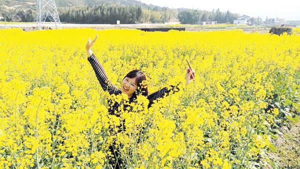 据介绍,油菜花一般于2—3月份开花,花期有一个多月左右。眼下新春里,走在仙游县北部环山区的乡村小路上,沐浴着和煦吹拂的春风,呼吸着空气中飘满的甜蜜香味,观赏着黄灿灿的油菜花和青翠欲滴的油菜叶,花海潮起潮落,绿海金浪奔腾着起伏着,像变幻多端的画卷惹人心醉,让前来赏花的游客连呼过瘾,或徜徉其间,或拍照留念,或与花来个“亲密接触”,享受着何其惬意的踏青之旅。游客刘美花女士说:“今天来到九鲤湖畔金灿灿的油菜花地,我非常开心,生活的烦恼、工作的压力被油菜花香全部冲淡了,带给我的是全身心的喜悦、轻松,我要把新春的祝福和新春的梦想,放飞在这片金灿灿的油菜花地里!” (陈国孟)