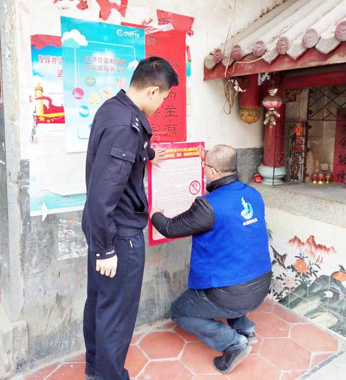 为进一步加强辖区春节期间烟花爆竹安全管理,严防各类燃放安全事故发生,确保辖区群众度过一个低碳、祥和、喜庆的春节,仙游县大济派出所积极组织民警深入辖区开展禁放烟花爆竹宣传工作。