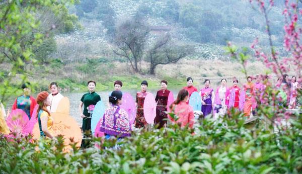 “张洋现在环境非常好,空气也很新鲜,有一种世外桃源的感觉,我们还要再来!”春天里的张洋村湘溪两岸桃红柳绿,花儿竞相开放,旗袍模特穿行在桃林间,引得前来踏青的游客和摄影家们频频举起相机拍照,定格着巍然屹立的田螺山、蜿蜒流淌的湘溪、硕果累累的枇杷树、换上新颜的古桥梁、田间劳作的村民……