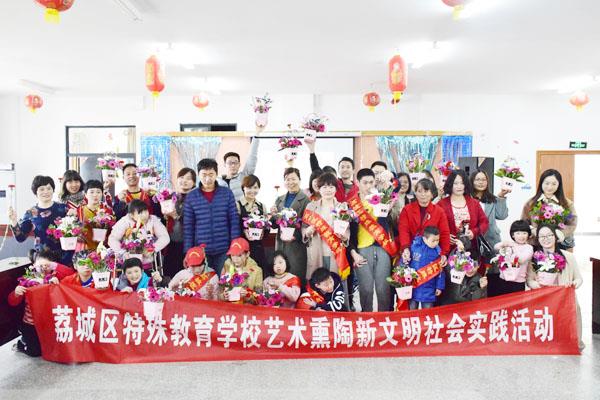 当天,荔城区特殊教育学校组织的艺术熏陶新文明社会实践活动也在该中心举行。部分智障、听障的学生在家长、老师的引导下,感受花艺美学的韵味。在认识各种花材及其寓意后,大家开始动手剪切一支支鲜花,并插入花篮。为了更好地呈现插花作品的艺术感,花艺师魏小云和每一位参与者进行沟通,聆听他们的创意,手把手改进大家的“处女作”。
