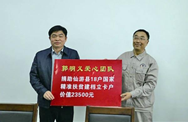 此次郭明义爱心团队能与仙游县贫困户结对帮扶,源于团队成员之一的莆田籍乡亲志愿者“小白”的倾情牵线。今年2月13日,“小白”与仙游县扶贫促进会取得联系捐助事宜,并初步筛选仙游县的20户国定重点贫困户作为帮扶对象。2月26日,“小白”从辽宁赶往仙游,入户核实情况后正式确定18户作为帮扶对象,并于3月4日将善款2.35万元以“郭明义”名义转入县扶贫促进会账户。在当日举行的捐助贫困户仪式上,特地风尘仆仆地从沈阳来到仙游的郭明义,详细了解这18户贫困户的扶贫项目,希望把扶贫项目落实落细,坚持因地制宜、因户施策,促进贫困户早日脱贫致富。他说,此行目的是为精准扶贫多做点实事,助力脱贫攻坚,同时他殷切地希望,当地县总工会要在助力脱贫攻坚决战中彰显作为、发挥重要作用。
