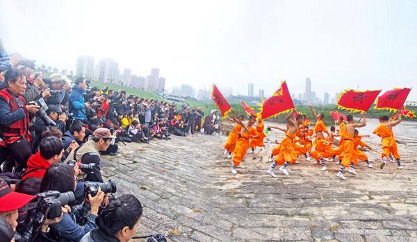 4月13日,莆阳大地,春意盎然,古堰古朴,溪水欢歌。莆田市摄影家协会“寻找最美木兰溪”摄影采风活动仪式在木兰陂公园启动,再次掀起了最美木兰溪创作热潮。来自全市的200多名摄影爱好者踊跃参与活动。活动现场,来自南少林武僧表演的沿陂行走诵经、挥旗舞拳、多人迭罗汉等禅宗武术节目,大大激发了摄影爱好者的创作热情,掀起了对最美木兰溪宣传热潮。图为摄影家手持长枪短炮把少林弟子精彩表演收入镜头现场一瞥。 (陈宝柱)