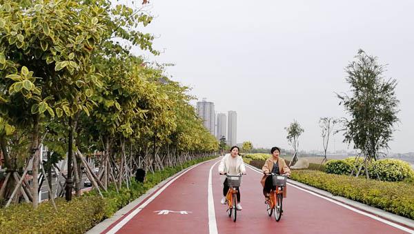 市民骑着自行车,在木兰溪畔的绿道上休闲健身。
