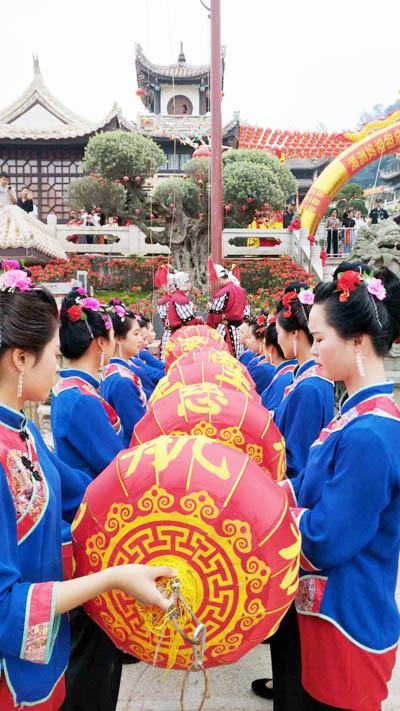 升幡庆妈祖千秋圣诞,挂灯引黎明万里慈航。随着鸣啰声响,16位号手引领着24位护幡湄洲女,在悠扬的妈祖音乐声中缓缓拾级而上并依次就位。伴着三声长号,众人目送着两面“天上圣母”幡旗和18盏红灯在旗手的引领下缓缓升起,大家凝视幡旗和灯笼,默默地虔诚祈福。