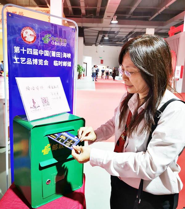 来自台湾嘉义的杨玲这一次是专程从台湾来观看艺博会的,她现场邮寄了一封盖有艺博会纪念邮戳的明信片给台湾的亲朋好友