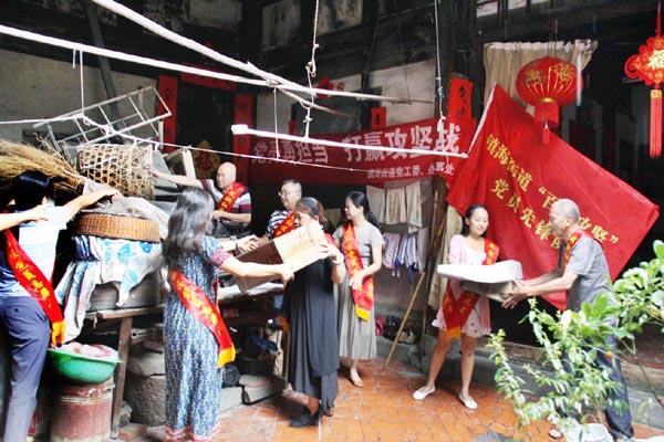 为进一步巩固社区的文明创建成果,维护辖区环境卫生,并为居民群众创建良好的生活环境。8月16日,镇海街道文献社区党支部组织20多位“百日攻坚”党员先锋队的队员,走进辖区金桥巷开展“清洁家园——环境整治活动”义务劳动。图为先锋队的队员们在一居民古屋中,对陈年暴露的垃圾和多年遗留的堆物进行清除、全面整治。 (子木)