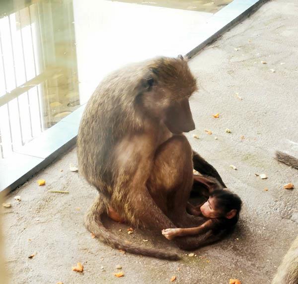 这只小狒狒和妈妈一起住在玻璃房里,这几天游客很难隔着玻璃见到小狒狒的真容。小狒狒的毛发颜色比它妈妈深,呈灰黑色,小家伙大部分时间就躲在妈妈怀里吃奶睡觉。阳光好时,母狒狒会抱着小狒狒一起晒太阳。母狒狒偶尔会把小狒狒放在地上,教它在地上采食的动作。母狒狒今年3岁,因第一次做妈妈,对孩子保护得非常紧,不轻易让孩子在陌生人前露面,即使面对平时熟悉的饲养员,也不让靠近小狒狒。小狒狒出生好几天了,大家仍无法得知它的性别。