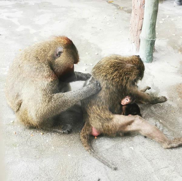 饲养员告诉记者,狒狒妈妈在狒狒宝宝出生后就紧紧地抱着它,时不时就疼爱地抱起自己的孩子舔舐和喂奶,而爸爸非常保护妈妈和它们的新生儿,几乎寸步不离。当妈妈和宝宝睡午觉时,爸爸甚至坐在它们身旁,看着它们。