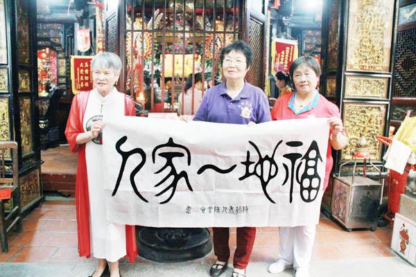 6月17日,台湾女书法家陈素兴(左)向莆田文峰天后宫管委会主任陈鹭玲赠送墨宝。莆田文峰天后宫为进一步弘扬妈祖的大爱精神,特邀请了20多位知名书画家,成立文峰宫妈祖义工艺术团诗书画理事会,加大对妈祖文化的宣传。 (子木)