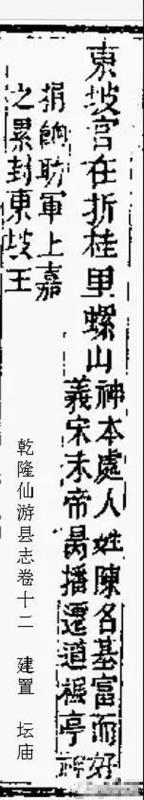 再据乾隆版《仙游县志·坛庙》记载:“东坡宫,在折桂里螺山,神本处人,姓陈名基,富而好义。宋末,帝昺(即宋端宗赵昺)播迁,道枫亭,神捐饷助军,上嘉之,累封东坡王。”由是可知,陈基捐饷助宋抗元的事迹属实。再加上,现今塘坡宫中既有奉祀东坡王陈基,还奉祀有卢氏娘娘,则说明我仙游卢氏女流确实也曾佐宋抗元,这才会被榜头群众奉祀至今,令人肃然起敬。