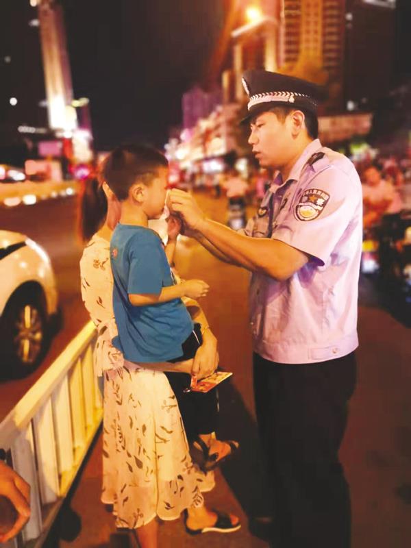 10月5日晚,城厢区凤凰山街道南湖公园的喷泉前花团锦簇、人山人海,广大人民群众在喜气洋洋的氛围中欢庆中华人民共和国成立70周年。凤凰山派出所民警在广场巡逻过程中,发现一名与父母走散而哭闹不已的小孩。为防止小孩在熙熙攘攘的人群中受到其它伤害,民警蔡力勇联合群众立即抱起孩子到人烟稀少的广场出入口,并耐心地进行安抚、帮其擦眼泪,详细询问其相关情况。同时,一边安排警力在广场上寻找小孩父母并向市公安局110指挥中心报备。在报备后,已焦急万分的小孩父母在拨打110指挥中心报警电话得知后,急匆匆赶到广场入口接回小孩,并对民警们热心救助表达了由衷的谢意。 (时报记者 林锦堂 通讯员 柯益妹)