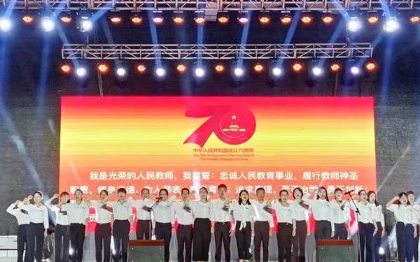 文艺晚会在气势恢宏的开场舞龙舞狮、武术《中国功夫》中拉开序幕。舞蹈《舞动中国》以丰富的肢体语言,呈现了共和国70年披荆斩棘、风雨兼程的艰辛历史和中国人民自力更生、艰苦奋斗的恢弘画卷。其间,还举行2018-2019年获得各级荣誉称号教师表彰会。20多位新任教师集体宣誓,重温师德规范,坚定奉献教育事业、立志教书育人的信心和决心。