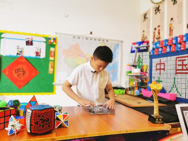 “3.14159265358……”付博焰一边背圆周率500位一边还原魔方。刚一见面,付博焰就给记者展示了魔方的不同玩法。“魔方玩法繁多,基本目的是把打乱的模块迅速还原。”他一边娴熟地转着一边轻松地说,“我不仅会边玩魔方边背圆周率和世界国家名称,还会单手复原魔方单手摇迷你色子魔方!”只见付博焰灵活的手指上下翻飞,伴随着“”咔咔咔”的旋转声,1个完全被打乱的魔方半分钟内,就在单手的操纵下复原而且另一手的5个魔方色子也竖立起来……,在付博焰家中,记者见到了陪他一起成长的大大小小近百个魔方,它们造型各异,颜色多样。付博焰年纪虽小,却已是一个自信大方、气场十足的帅小伙,并且在他的魔方世界闯出了一片天地。之后,他又展示了解如何数字华容道,用了很少的步数,不到16秒,就将棋盘上散乱的数字方块,按照从左到右、从上到下的顺序重新排列整齐了。