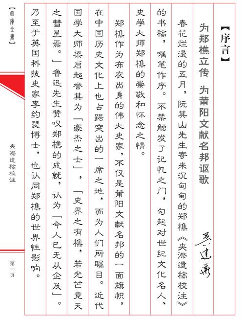 郑樵“山林三十年,著书千卷”和“布衣上殿”的奇崛人生,以一己之力纂修钜制《通志》的丰功伟绩,以及读书治学岁月里所显露的报国忧民情怀,学术上解放思想,锐于批判陈旧学说,勇于开拓创新的精神,无疑是莆田文献名邦的一笔巨大的文化遗产和宝贵的精神财富,是当今培植文化自信最为亲切生动的乡土教材。传承郑樵如此博大精深的文化遗产,发扬郑樵的学术精神,乃是今天我们不可忽略的历史责任。由此看来,阮其山先生新著《郑樵夹漈遗稿校注》的出版,可谓适逢其时,不但具有史学上的学术上的意义,也紧紧地贴近宏阔的时代精神。