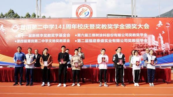 随后,爱心企业和校友进行了捐赠仪式,他们尊师重教、奖掖后学、造福桑梓的义举让人敬佩。党委副书记林永福代表学校接受了捐赠牌匾。新桃李奖教奖学基金捐赠人民币15万元,三棵树涂料股份有限公司捐赠人民币50万元,文地奖教基金捐赠人民币10万元,福建泰盛实业有限公司捐赠人民币35万元。