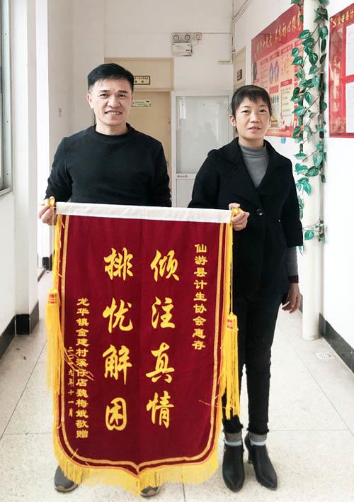11月28日上午,仙游县龙华镇金建村魏梅娥将印有:“排忧解困、倾注真情”的锦旗送到县计生协会办公室,同时还激动地对工作人员说:“感谢党的好政策,让我成功地完成换肾手术,重获新生。”