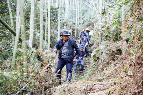 沿着蜿蜒崎岖的山路行进了两个多小时后,工作组一行来到涵江区庄边镇山溪村下田自然村,由于此行的目的地位于人烟罕至的山脊上,大家只好弃车步行前往。进入林区,映入眼帘的是翠绿的竹林,茂密的植被和各种奇花异草,回荡在耳畔的是溪水潺潺声,清脆的鸟鸣声,仿佛置身于一幅美丽的山水画中,令人心旷神怡。尽管风景如画,但大家无心停下欣赏身边的美景,脚步匆匆赶往目的地,大家深一脚,浅一脚艰难的行进着,或踏着厚厚的落叶,或踩着羊肠般大小的斜坡,或俯身钻过横卧的树干,渴了,停下喝口水,累了,席地休息,汗水在大家身上湿了又干,干了又湿,三个多小时的翻山越岭和一路劈荆斩刺,中午1时许,大家终于顺利到达目的地。成功登顶后,大家已是饥肠辘辘、汗流浃背,顾不上看一眼山峰美景,取出随身携带的饮用水和面包等干粮充饥后,又马不停蹄的寻找界桩位置,核对坐标、拌水泥、挖坑、树界桩、描红……大家齐心协力又分工明确,经过两个小时的协作,一座全新的、标准化的边界界桩矗立在仙游、涵江、永泰三县(区)边界的山脊顶上,在阳光的映衬下,新的界桩显得十分庄严、夺目。