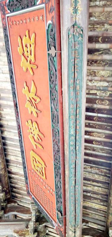 梅峰寺天王殿后瞻拜亭的横檩上阳刻:赐进士出身、甘肃布政使、署陕甘总督、前给事中御史、刑部员外郎、军机章京、广西乡试大主考林扬祖偕男候选儒学训导林寿勲、举人内阁中书林寿煦捐修。