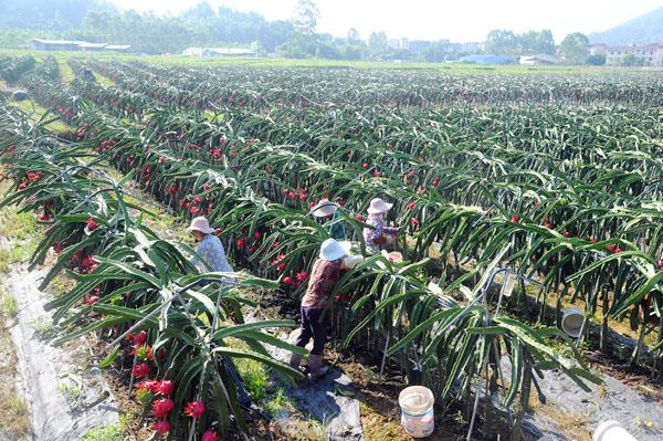 农场主郑伟明说,采摘园里的红心“皇冠”“蜜红”“软枝大红”三个品种的火龙果全是去年3月份从台湾直接引进优质火龙果品种,目前是我市台湾免授粉红心火龙果标准化基地。郑伟明原是大济镇龙坂村党支部书记。近年来,在农业产业结构调整中,他看到该村双桂岩山下及周围部分农旱地、废杂地抛荒感到心痛,为了振兴“美丽新大济”加快新农村建设,提升耕地的品位,促进农田增效、农业增产、农民增收,促进农村致富。去年3月,他注册了“仙游县大济绿康农场”投资200多万元,第一期承包4.7万平方米的耕地,种植火龙果、广西沙糖桔、马来西亚扬桃5多亩、芭乐等,并聘请了广西荔普县的果蔬专家当技术员作果园管理指导。他还解决了当地20多人的农村富余劳力的就业问题。
