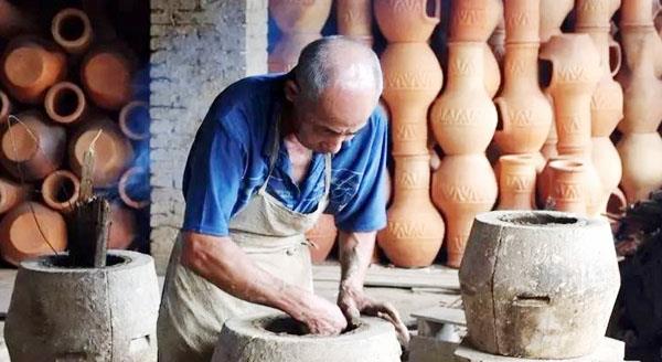 那时,制陶方式一直沿袭古老而复杂的土陶制作工艺:先将窑土浆泡,经揉、和,使窑土有黏性和强度,再捏坯成型,经削、刮、刻后一一晾干,接着制作简单的花纹后上釉,最后装进窑灶炉火烧制,散热后出窑。土陶的选料、捏坯、印纹、上釉、烧制、晾干等前后有十几道工序,全部需要用手工完成。土陶制品看似古朴、笨拙,但需要极其精细的功夫。