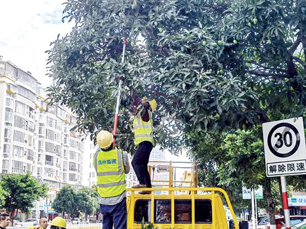 近日,记者在学园路看到,为避免市民私自采摘芒果,导致意外发生,市园林部门正对路边的绿化芒进行统一的人工摘除,消除安全隐患。