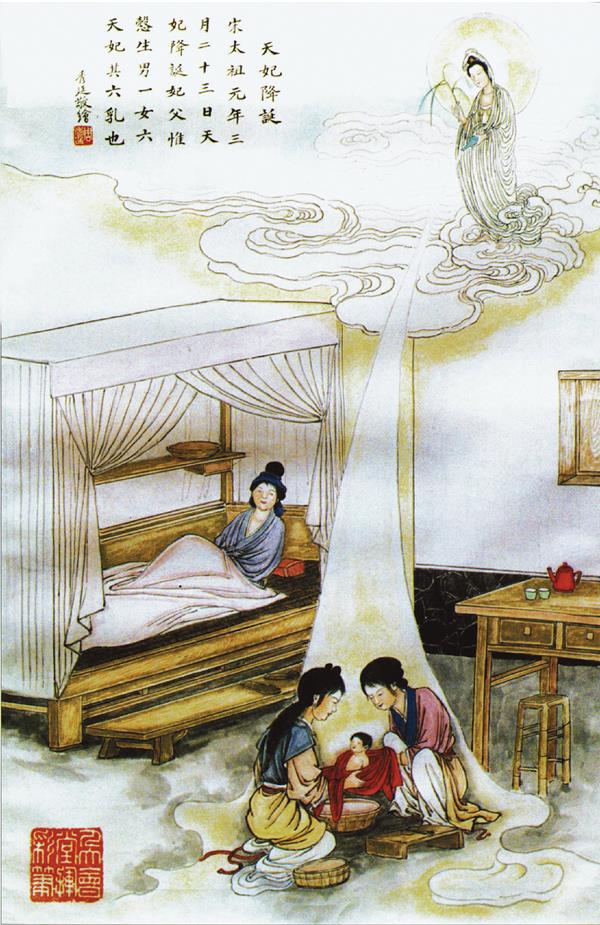 妈祖是中国乃至世界华人聚居区的民间信仰神祇,对其故事了解并认知妈祖的生平事迹可归纳为几点:孝顺、睦邻、济民、救急、驱邪、祛病等,这些传说加以神化,决定了妈祖神格内容的宗教色彩。于是,作为人的妈祖具备“神性”,在世时就已经以德行高尚、广施善事和救民疾苦的神话渊源而远近闻名了。例如,《天妃降诞》(图1)描绘宋太祖建隆元年(960)农历三月廿三日傍晚,妈祖出生时既神妙又动人的场景。如见一道红光从西北射入卧室,出现于画面上手持净瓶的观音形象,显现了妈祖与佛教观世音菩萨的信仰之间密不可分的溯源关系,也让妈祖的诞生披上一层神秘的宗教色彩。