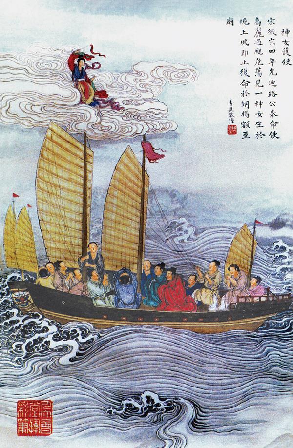 千年守望,妈祖的神格传承和维系着中华民族优秀传统文化的精神,成为全球华人文化认同的标志。所谓妈祖“托梦神助”的说法,正是显示妈祖庇护人民航海安全时的神格形象,转化为航海者的心理因素以产生鼓舞力量,推动其去征服人间危难。比如《机上救亲》描绘秋九月,父亲与兄长渡海北上遇难,妈祖在纺织机上出元神救亲人的动人场景。画面中妈祖在纺织机前织布时似假寐状,而灵魂则出窍到海上拯救父兄,身后的母亲正在拍醒她。虽然《舫海寻兄》(图2)反映了与《天妃显圣录》中“机上救亲”同一则的故事,但是却表现出与其他圣迹故事图像不一样的情景,妈祖冒险出海拯救遇难的父兄时,她身体倾斜几乎与海洋面平行状态,画面要求一切线、形、色的搭配从属于这一大动势线的结构美感。题识为:“时天后父兄舟几倾覆天后空中垂手援之”。随着元、明时期航海交通日益发达,妈祖作为海上安全保护神的地位和声望也随之提升。《周秀廷妈祖故事画册》通过“妈祖显灵”的神格形象来宣扬人类勇于同大自然进行命运搏斗的宏愿,展示了民间信众的善良愿望、美好理想和自强不息的精神,也反映出妈祖信仰对于我国海洋事业的发展与促进。