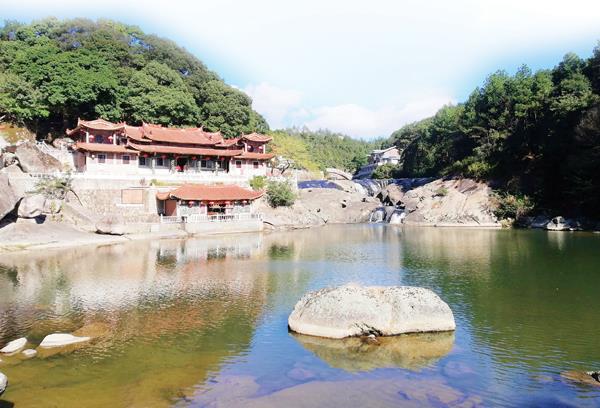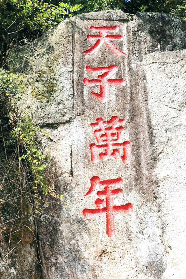 南宋“清源郡侯”陈谠题写的“天子万年”竖式楷书镌刻,字径90厘米,笔体雄健有力,充分体现了陈谠忠贞爱国的家国情怀。天子万年石,位于玉帝楼后之南侧,石壁峭立,如刀切斧劈,高约10米。明福建推官周世臣诗:“寂寂明时镜,斑斑宋代书;万年瞻赤鲤,高处有仙居。”